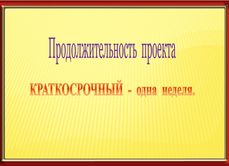 Продолжительность проектаКРАТКОСРОЧНЫЙ - одна неделя.