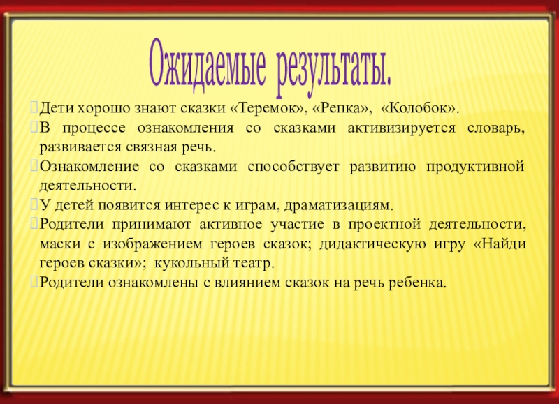 Ожидаемые результаты.Дети хорошо знают сказки «Теремок», «Репка», «Колобок».В процессе ознакомления со сказками активизируется словарь, развивается связная речь.Ознакомление