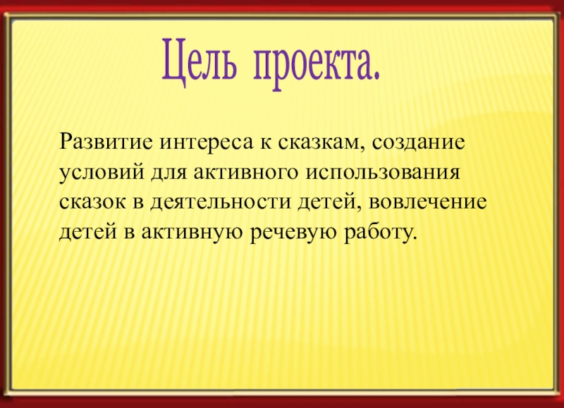 Цель проекта.Развитие интереса к сказкам, создание условий для активного использования сказок в деятельности детей, вовлечение детей в