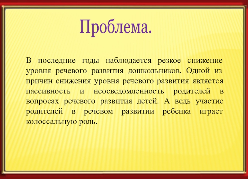 Проблема.В последние годы наблюдается резкое снижение уровня речевого развития дошкольников. Одной из причин снижения уровня речевого развития