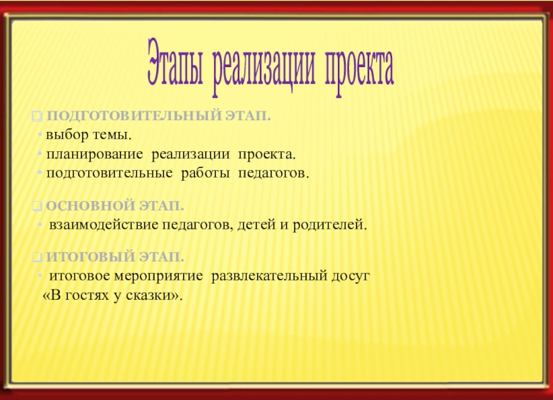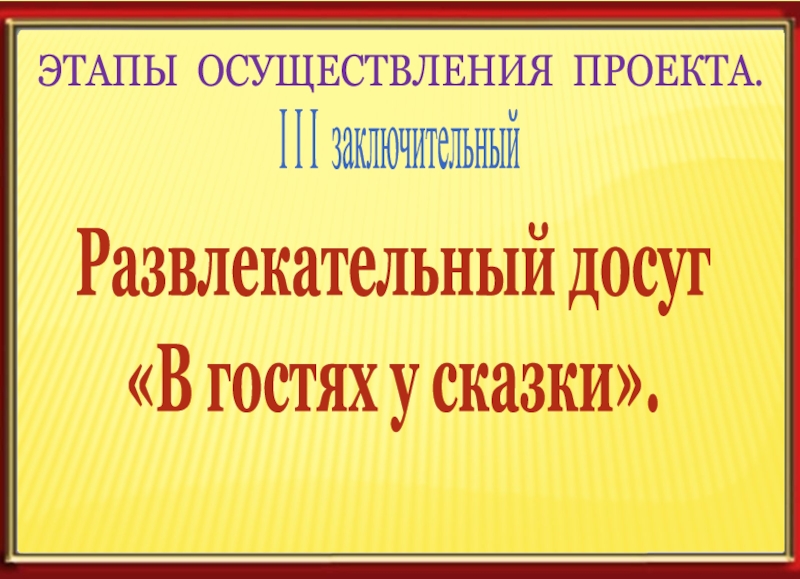 ЭТАПЫ ОСУЩЕСТВЛЕНИЯ ПРОЕКТА.I I I заключительныйРазвлекательный досуг «В гостях у сказки».