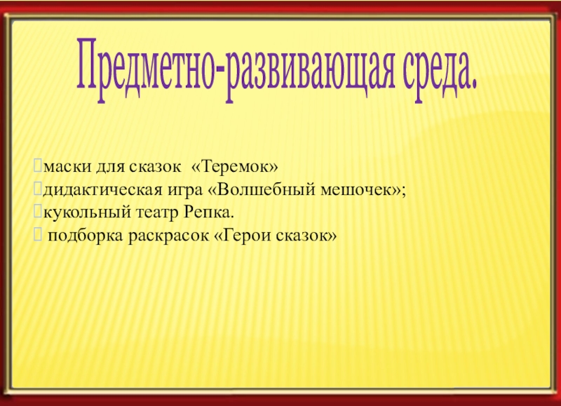 Предметно-развивающая среда.маски для сказок «Теремок»дидактическая игра «Волшебный мешочек»; кукольный театр Репка. подборка раскрасок «Герои сказок»
