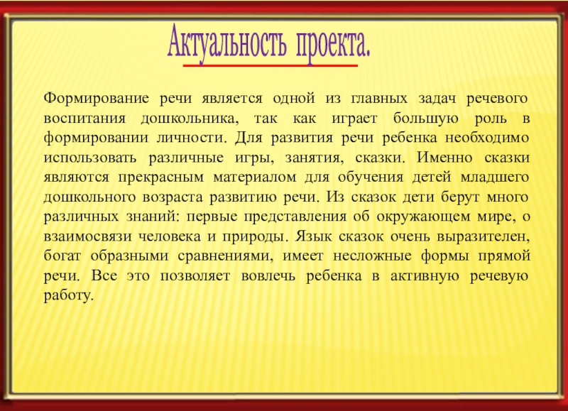 Актуальность проекта.Формирование речи является одной из главных задач речевого воспитания дошкольника, так как играет большую роль в