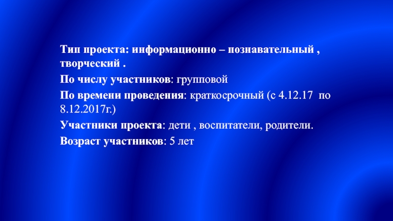Слайд 2Тип проекта: информационно – познавательный , творческий .