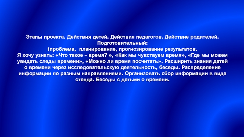 Я хочу узнать: «Что такое – время? », «Как мы чувствуем время», «Где мы можем увидеть следы времени», «Можно ли время посчитать». Расширить знания детей о времени через исследовательскую деятельность, беседы. Распределение информации по разным направлениями. Организовать сбор информации в виде стенда. Беседы с детьми о времени.