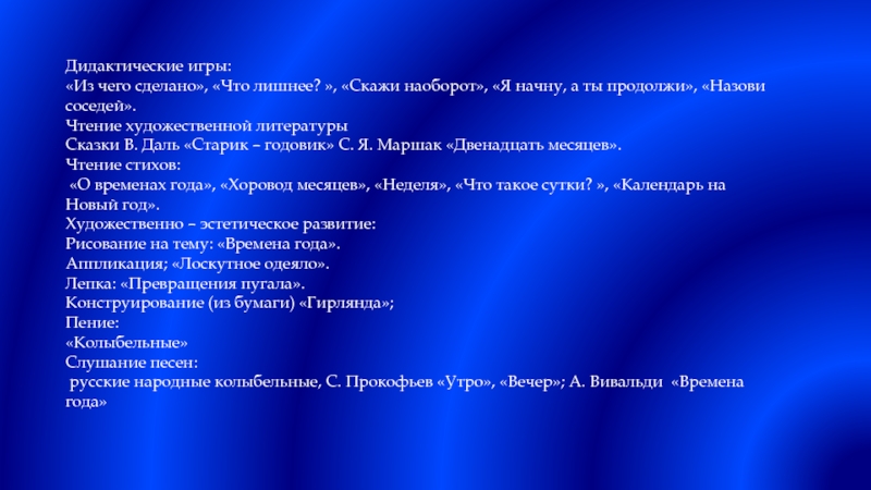 Сказки В. Даль «Старик – годовик» С. Я. Маршак «Двенадцать месяцев».