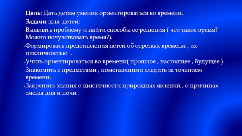 Слайд 4Цель: Дать детям умения ориентироваться во времени.