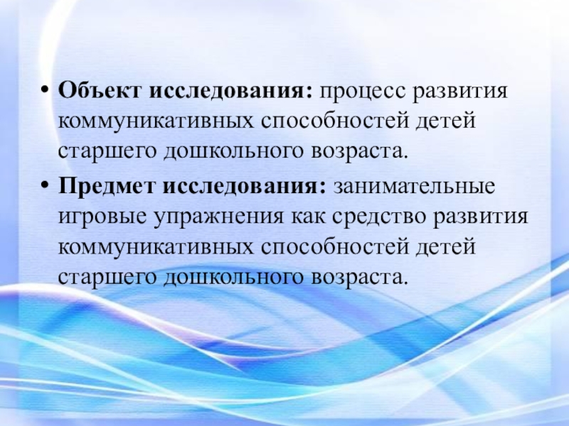 Слайд 4Объект исследования: процесс развития коммуникативных способностей детей старшего дошкольного возраста.