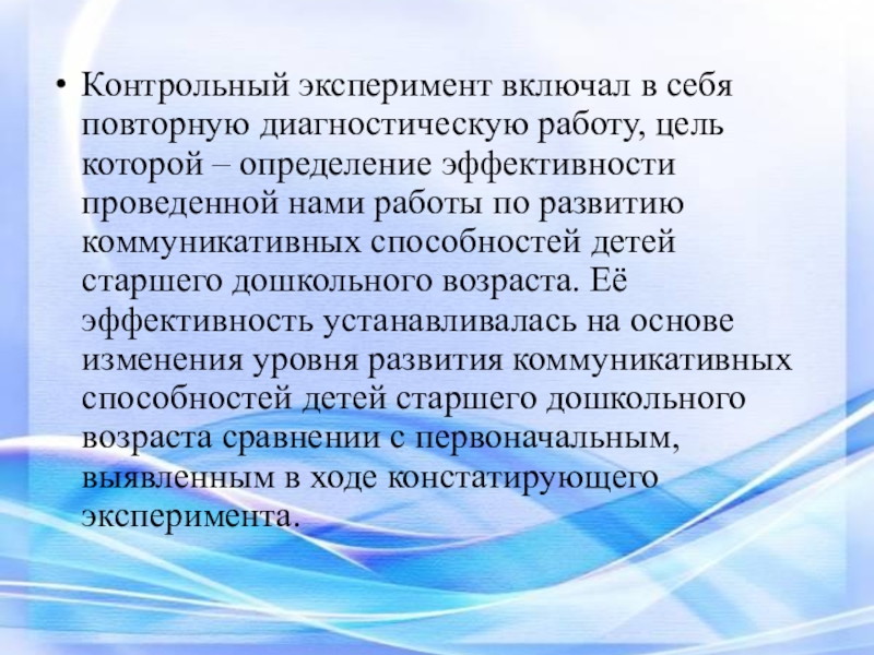 определение эффективности проведенной нами работы по развитию коммуникативных способностей детей старшего дошкольного возраста. Её эффективность устанавливалась на основе изменения уровня развития коммуникативных способностей детей старшего дошкольного возраста сравнении с первоначальным, выявленным в ходе констатирующего эксперимента.