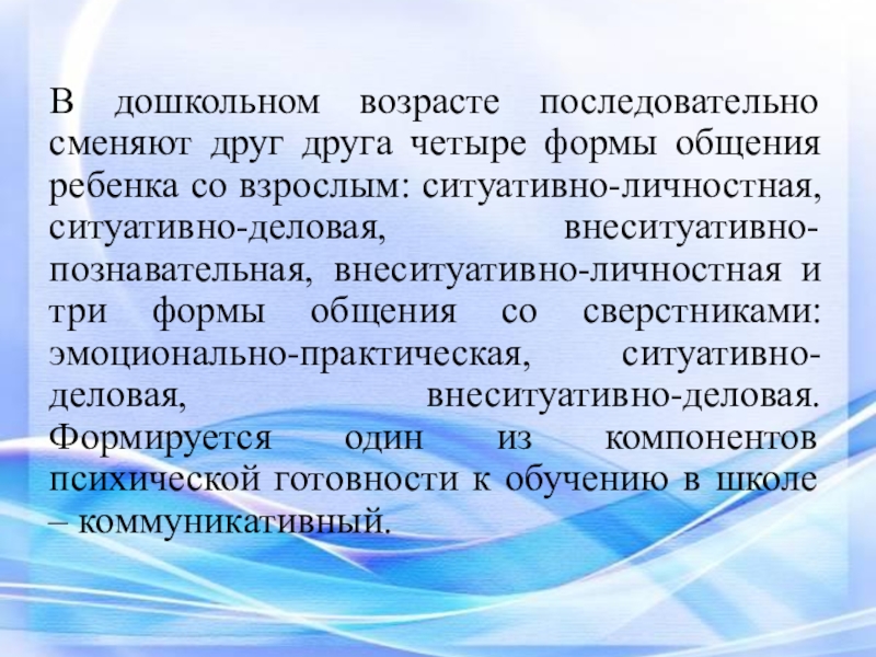 со взрослым: ситуативно-личностная, ситуативно-деловая, внеситуативно-познавательная, внеситуативно-личностная и три формы общения со сверстниками: эмоционально-практическая, ситуативно-деловая, внеситуативно-деловая. Формируется один из компонентов психической готовности к обучению в школе – коммуникативный.