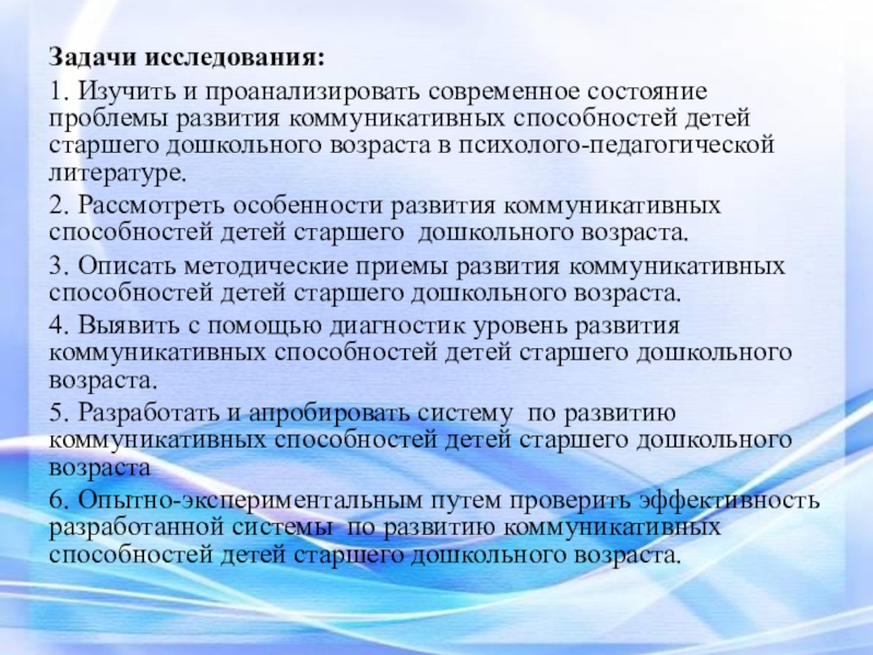 6. Опытно-экспериментальным путем проверить эффективность разработанной системы по развитию коммуникативных способностей детей старшего дошкольного возраста.