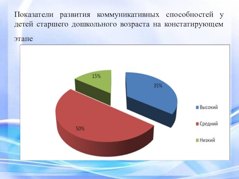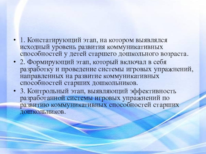 Слайд 121. Констатирующий этап, на котором выявлялся исходный уровень развития коммуникативных способностей