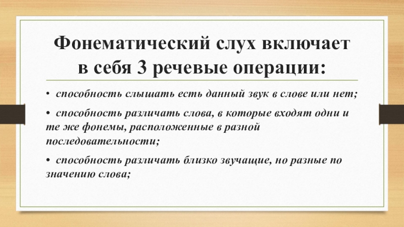 Слайд 3Фонематический слух включает в себя 3 речевые операции:
