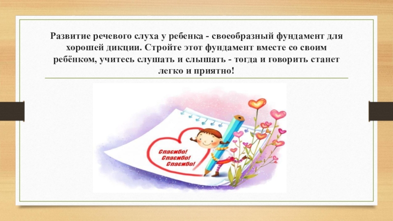 Слайд 16Развитие речевого слуха у ребенка - своеобразный фундамент для хорошей дикции.