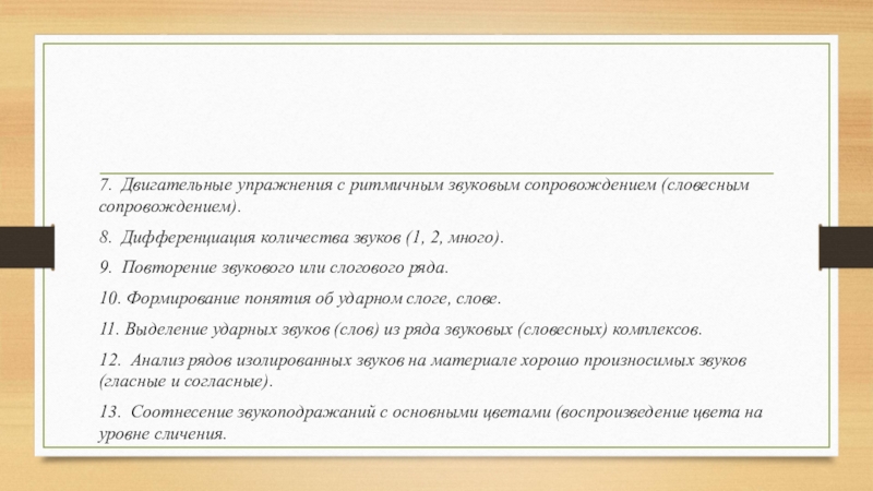 7. Двигательные упражнения с ритмичным звуковым сопровождением (словесным сопровождением).