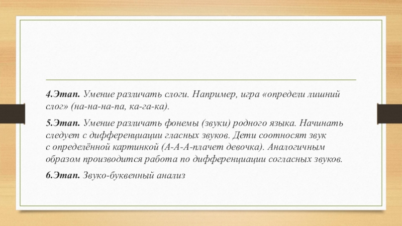 4.Этап. Умение различать слоги. Например, игра «определи лишний слог» (на-на-на-па, ка-га-ка).