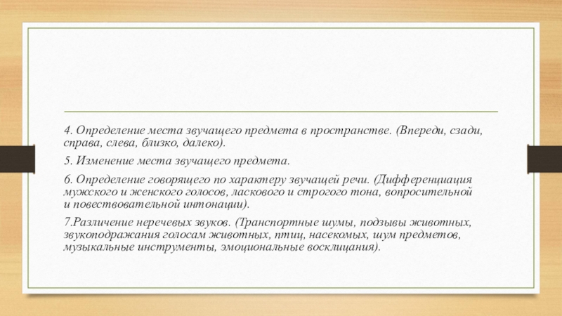 4. Определение места звучащего предмета в пространстве. (Впереди, сзади, справа, слева, близко, далеко).