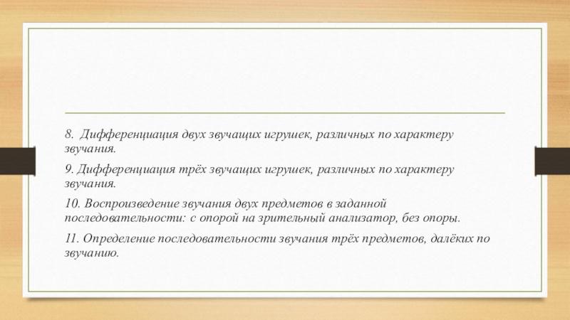 10. Воспроизведение звучания двух предметов в заданной последовательности: с опорой на зрительный анализатор, без опоры.