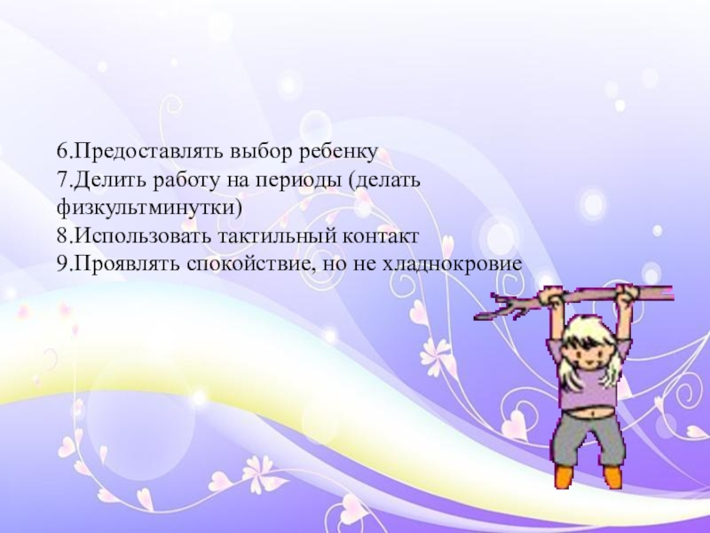 6.Предоставлять выбор ребенку7.Делить работу на периоды (делать физкультминутки) 8.Использовать тактильный контакт9.Проявлять спокойствие, но не хладнокровие