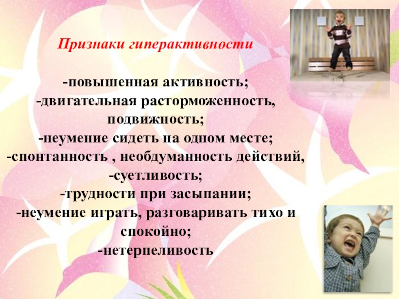 Признаки гиперактивности-повышенная активность;-двигательная расторможенность, подвижность;-неумение сидеть на одном месте;-спонтанность , необдуманность действий,-суетливость;-трудности при засыпании;-неумение играть, разговаривать