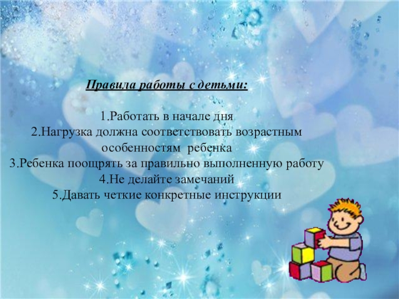 Правила работы с детьми:1.Работать в начале дня 2.Нагрузка должна соответствовать возрастным особенностям ребенка3.Ребенка поощрять за правильно выполненную