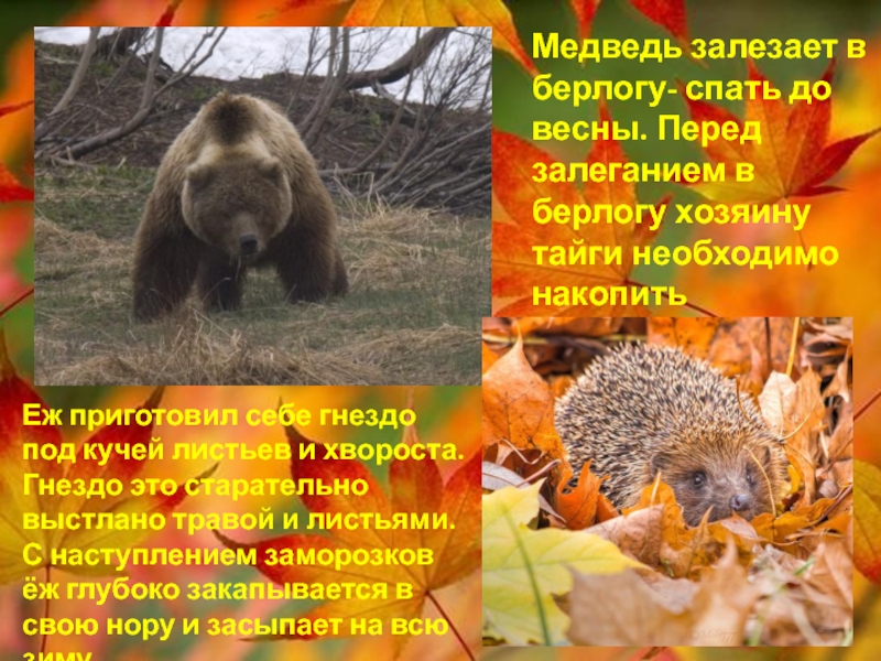 Еж приготовил себе гнездо под кучей листьев и хвороста. Гнездо это старательно выстлано травой и листьями. С наступлением заморозков ёж глубоко закапывается в свою нору и засыпает на всю зиму.