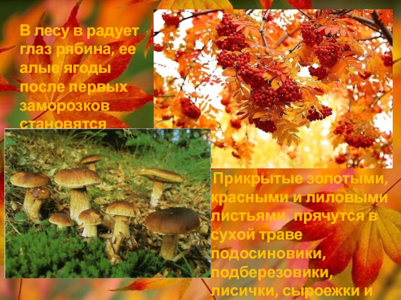 Прикрытые золотыми, красными и лиловыми листьями, прячутся в сухой траве подосиновики, подберезовики, лисички, сыроежки и грузди.
