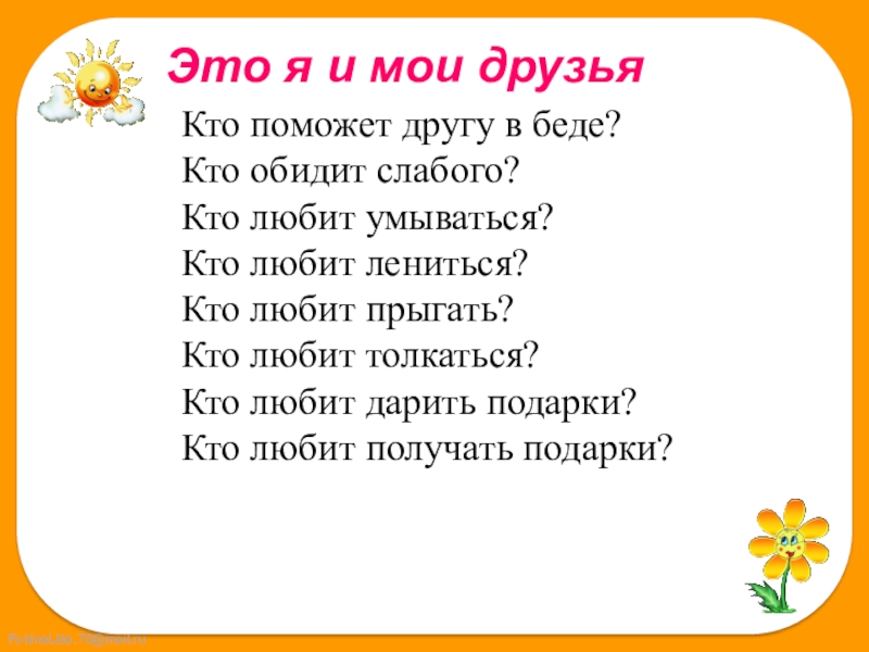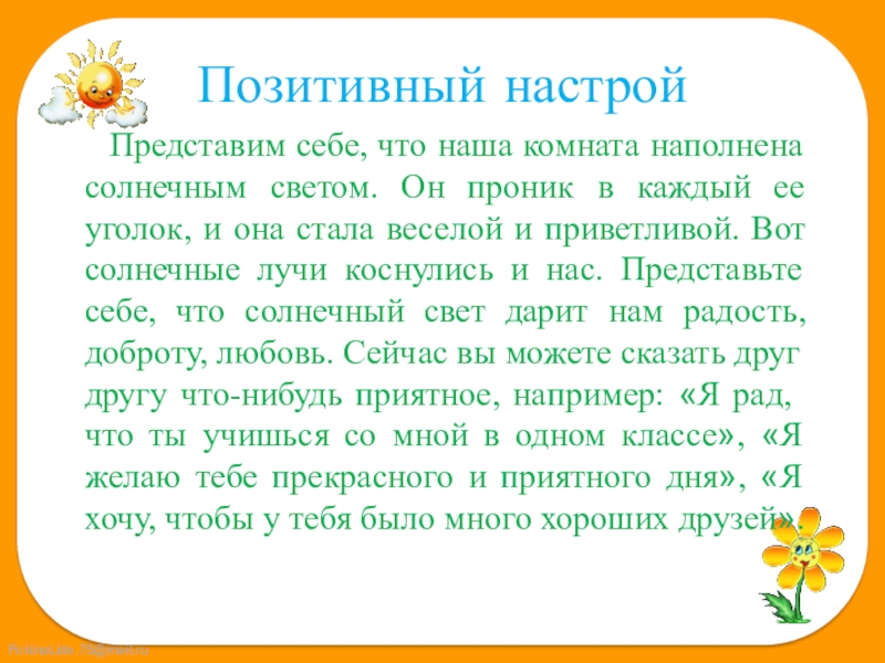 в каждый ее уголок, и она стала веселой и приветливой. Вот солнечные лучи коснулись и нас. Представьте себе, что солнечный свет дарит нам радость, доброту, любовь. Сейчас вы можете сказать друг другу что-нибудь приятное, например: «Я рад, что ты учишься со мной в одном классе», «Я желаю тебе прекрасного и приятного дня», «Я хочу, чтобы у тебя было много хороших друзей».
