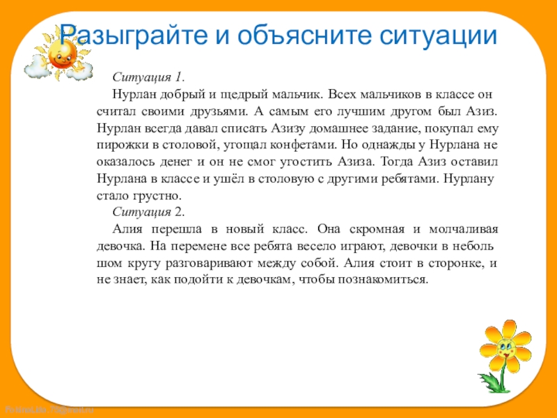 Алия перешла в новый класс. Она скромная и молчаливая девочка. На перемене все ребята весело играют, девочки в небольшом кругу разговаривают между собой. Алия стоит в сторонке, и не знает, как подойти к девочкам, чтобы познакомиться.