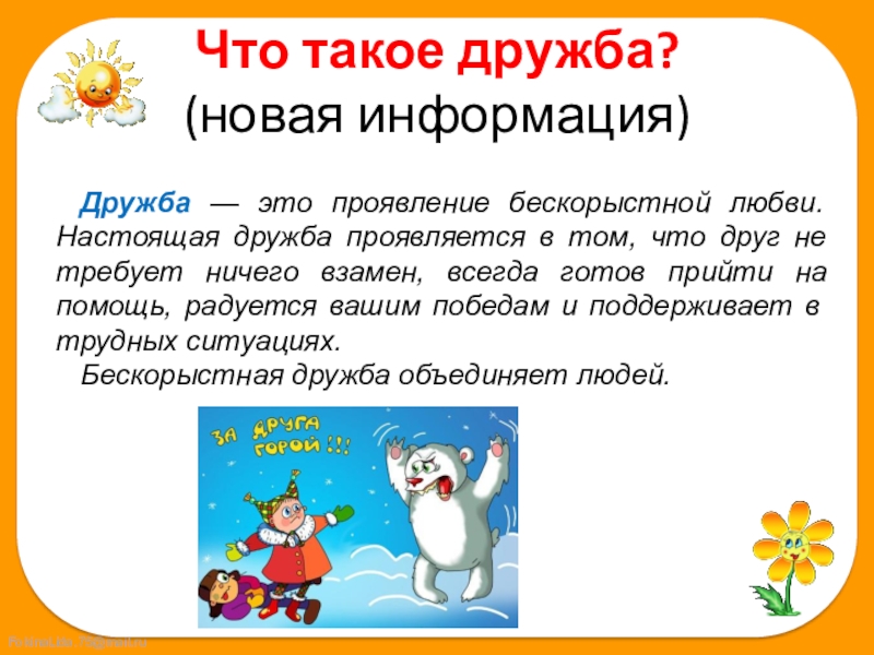 Дружба — это проявление бескорыстной любви. Настоящая дружба