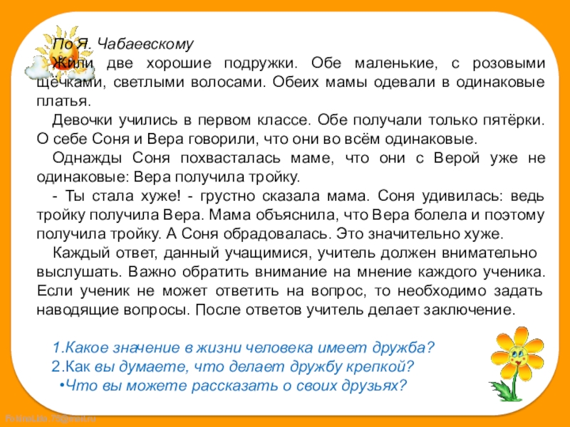 Каждый ответ, данный учащимися, учитель должен внимательно выслушать. Важно обратить внимание на мнение каждого ученика. Если ученик не может ответить на вопрос, то необходимо задать наводящие вопросы. После ответов учитель делает заключение.