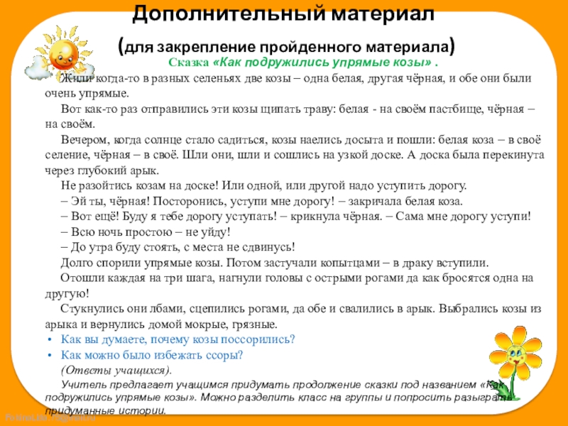 Учитель предлагает учащимся придумать продолжение сказки под названием «Как подружились упрямые козы». Можно разделить класс на группы и попросить разыграть придуманные истории.