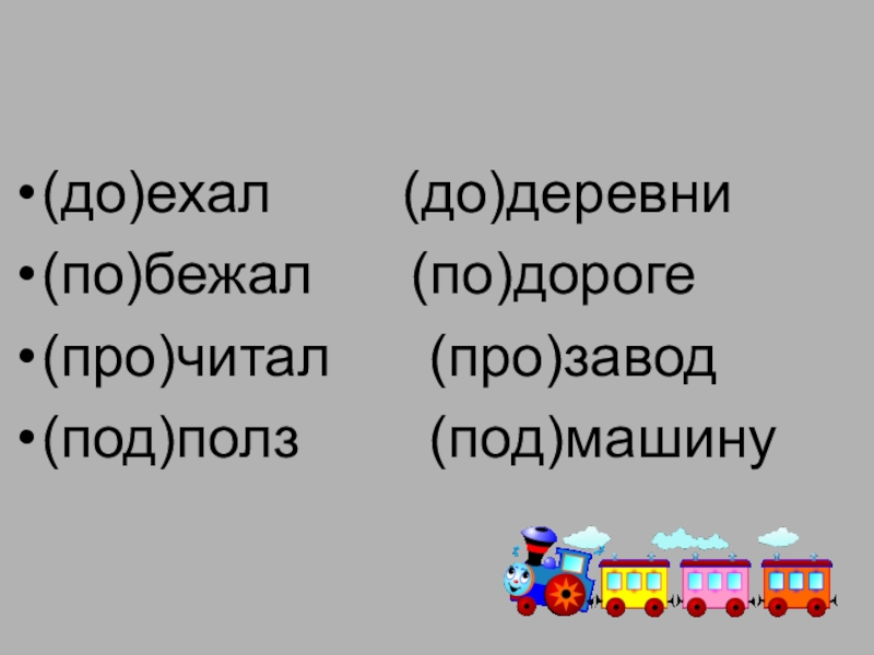 (до)ехал    (до)деревни(по)бежал   (по)дороге(про)читал   (про)завод(под)полз    (под)машину