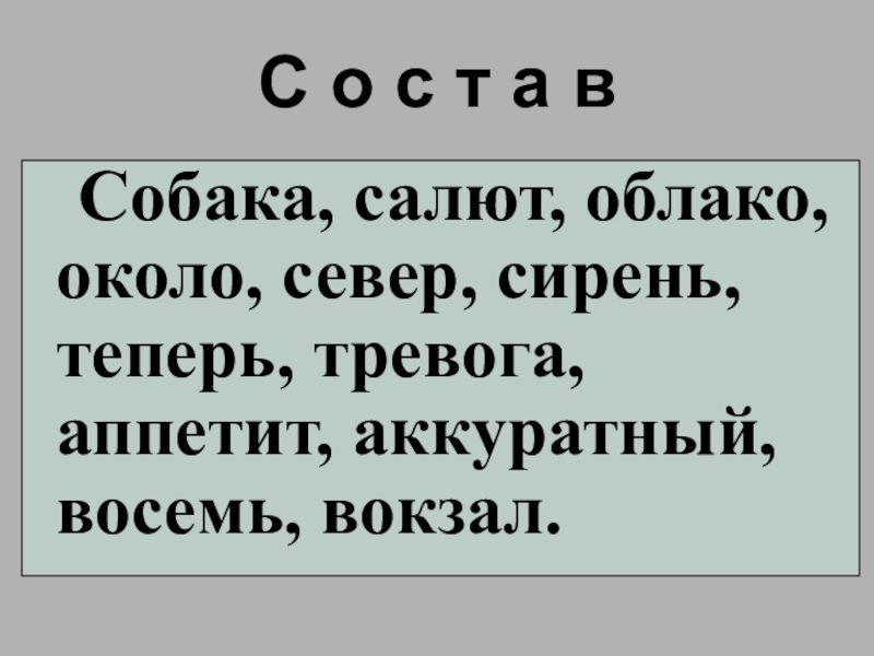 С о с т а в Собака, салют, облако, около, север, сирень, теперь, тревога, аппетит, аккуратный, восемь, вокзал.