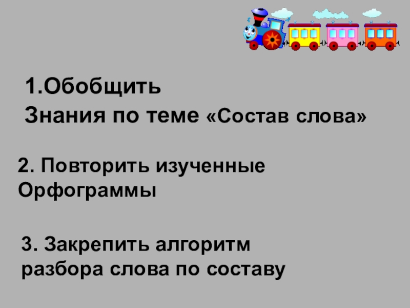 1.Обобщить Знания по теме «Состав слова»2. Повторить изученные Орфограммы 3. Закрепить алгоритмразбора слова по составу