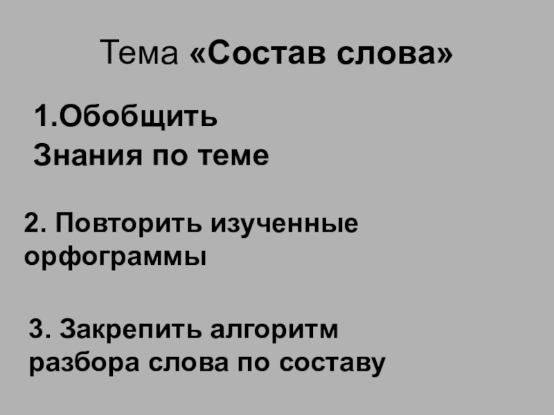 Тема «Состав слова»1.Обобщить Знания по теме 2. Повторить изученные орфограммы3. Закрепить алгоритмразбора слова по составу
