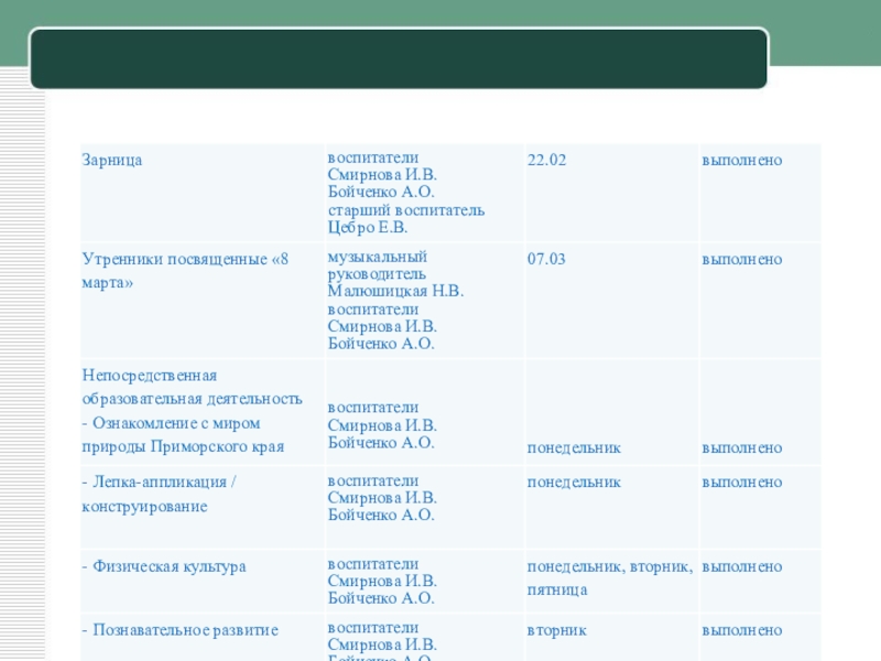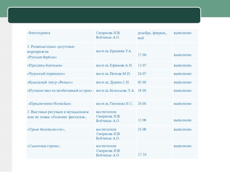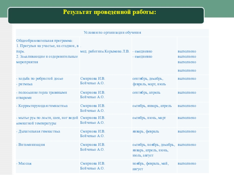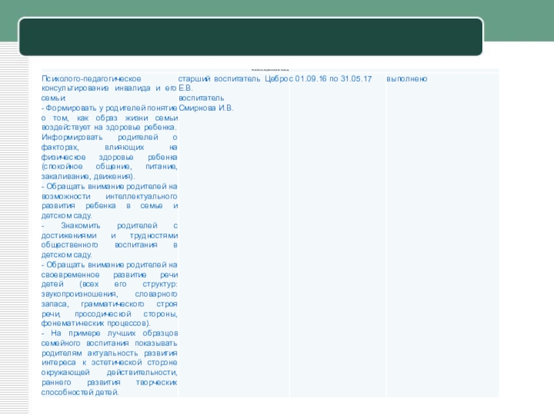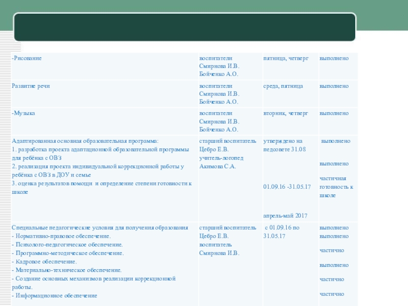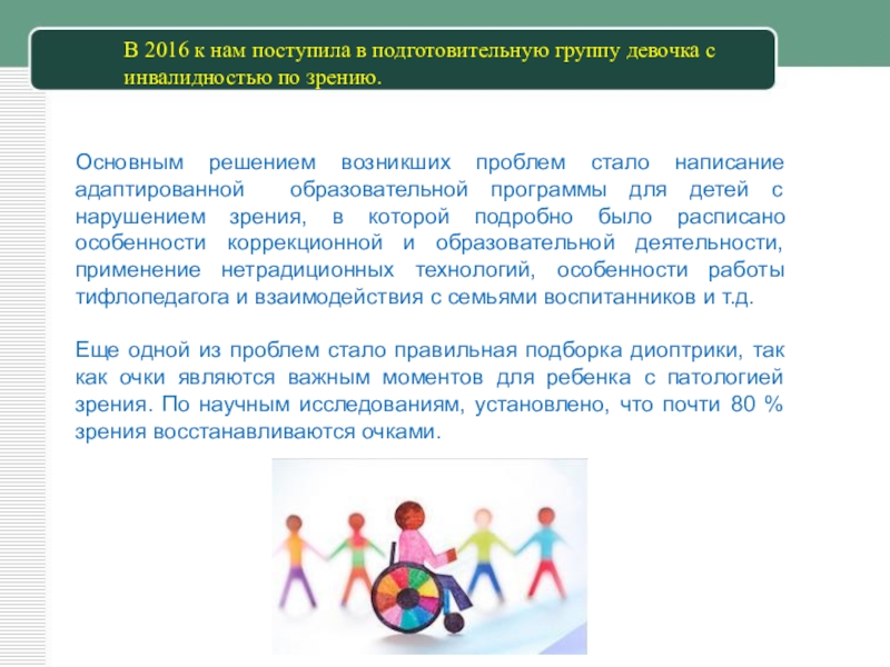 Основным решением возникших проблем стало написание адаптированной образовательной программы для детей с нарушением зрения, в которой подробно было расписано особенности коррекционной и образовательной деятельности, применение нетрадиционных технологий, особенности работы тифлопедагога и взаимодействия с семьями воспитанников и т.д.