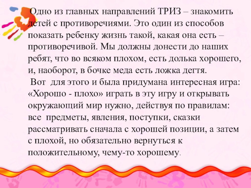 Слайд 5 Одно из главных направлений ТРИЗ – знакомить детей с противоречиями. Это