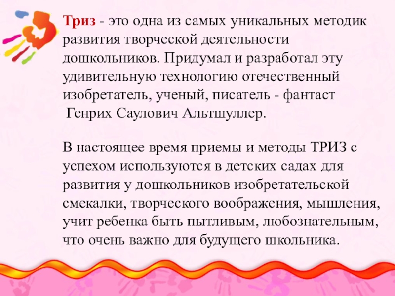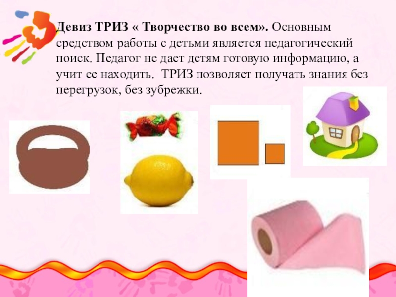 Девиз ТРИЗ « Творчество во всем». Основным средством работы с детьми