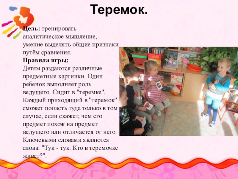 Детям раздаются различные предметные картинки. Один ребенок выполняет роль ведущего. Сидит в "теремке". Каждый приходящий в "теремок" сможет попасть туда только в том случае, если скажет, чем его предмет похож на предмет ведущего или отличается от него. Ключевыми словами являются слова: "Тук - тук. Кто в теремочке живет?".