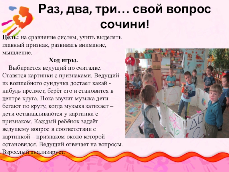 Выбирается ведущий по считалке. Ставятся картинки с признаками. Ведущий из волшебного сундучка достает какай - нибудь предмет, берёт его и становится в центре круга. Пока звучит музыка дети бегают по кругу, когда музыка затихает – дети останавливаются у картинки с признаком. Каждый ребёнок задаёт ведущему вопрос в соответствии с картинкой – признаком около которой остановился. Ведущий отвечает на вопросы. Взрослый анализирует.