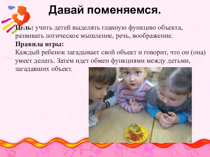 Каждый ребенок загадывает свой объект и говорит, что он (она) умеет делать. Затем идет обмен функциями между детьми, загадавших объект.