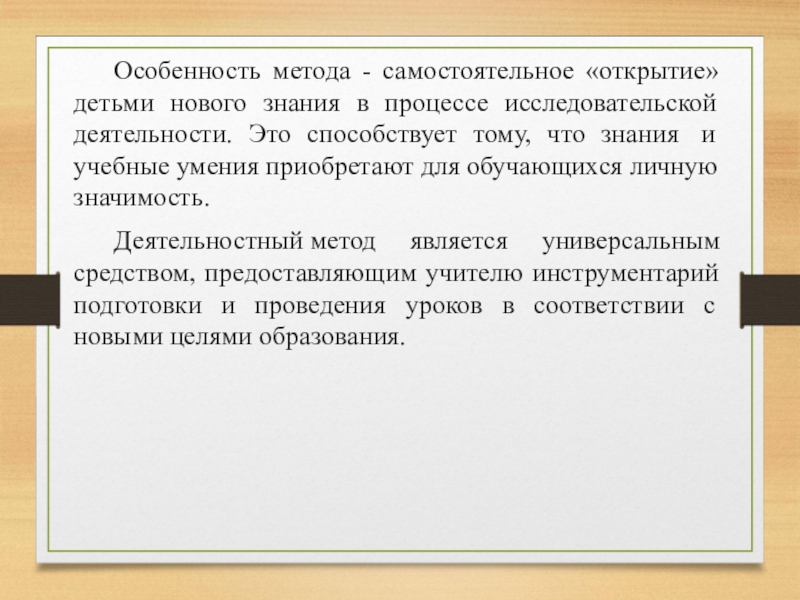 Деятельностный метод является универсальным средством, предоставляющим учителю инструментарий подготовки и проведения уроков в соответствии с новыми целями образования.