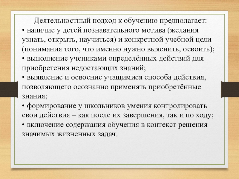 Слайд 7 Деятельностный подход к обучению предполагает: