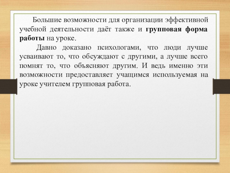Давно доказано психологами, что люди лучше усваивают то, что обсуждают с другими, а лучше всего помнят то, что объясняют другим. И ведь именно эти возможности предоставляет учащимся используемая на уроке учителем групповая работа.