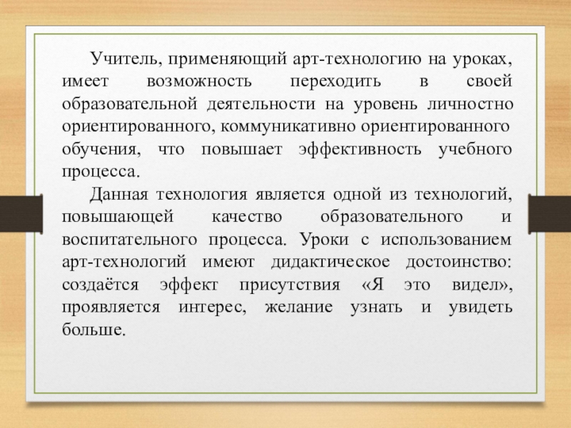 Данная технология является одной из технологий, повышающей качество образовательного и воспитательного процесса. Уроки с использованием арт-технологий имеют дидактическое достоинство: создаётся эффект присутствия «Я это видел», проявляется интерес, желание узнать и увидеть больше.