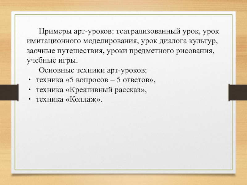 Примеры арт-уроков: театрализованный урок, урок имитационного моделирования, урок диалога культур, заочные путешествия,