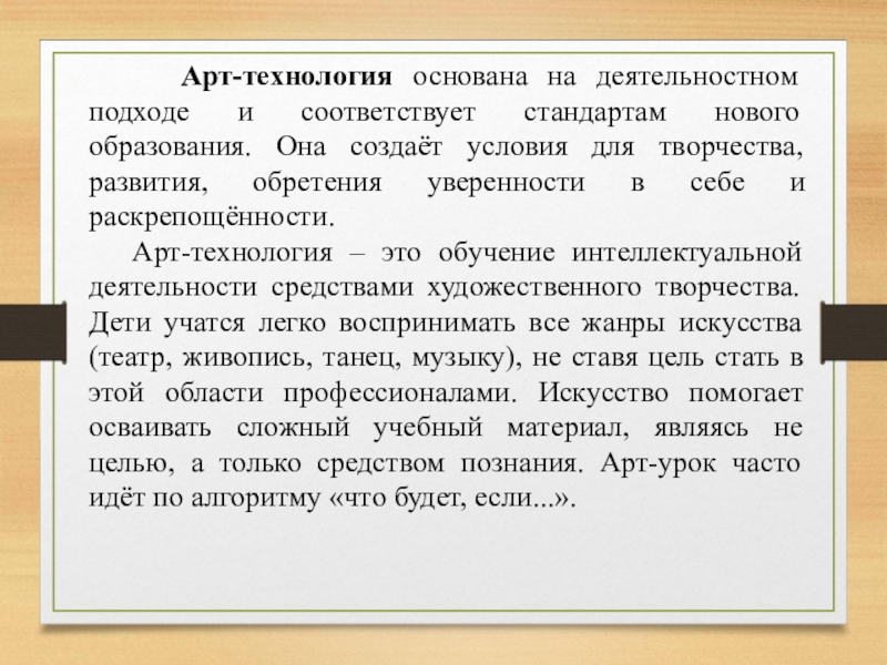 Арт-технология – это обучение интеллектуальной деятельности средствами художественного творчества. Дети учатся легко воспринимать все жанры искусства (театр, живопись, танец, музыку), не ставя цель стать в этой области профессионалами. Искусство помогает осваивать сложный учебный материал, являясь не целью, а только средством познания. Арт-урок часто идёт по алгоритму «что будет, если...».