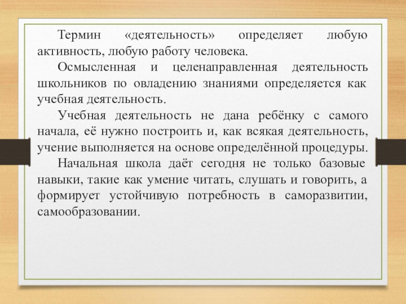 Учебная деятельность не дана ребёнку с самого начала, её нужно построить и, как всякая деятельность, учение выполняется на основе определённой процедуры.