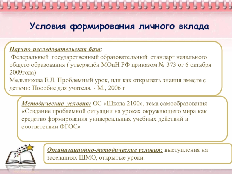 Методические условия: ОС «Школа 2100», тема самообразования «Создание проблемной ситуации на уроках окружающего мира как средство формирования универсальных учебных действий в соответствии ФГОС»